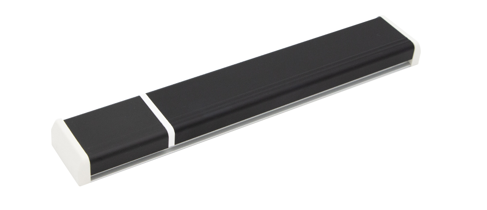 Armbågskontakt i svarteloxerad aluminium med vita endcaps.