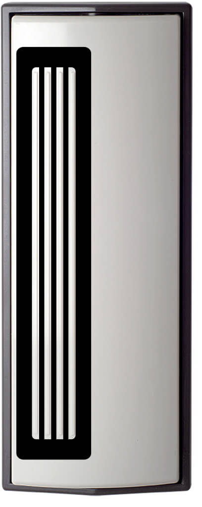 Armbågskontakt i plast med konvex tryckplatta och taktila rillor. Vitt lock och mörkgrå ram.