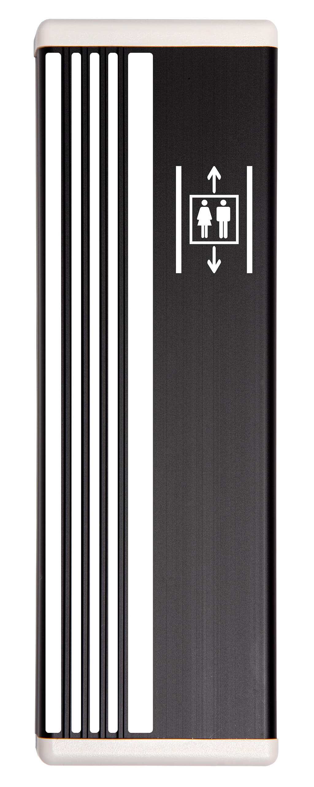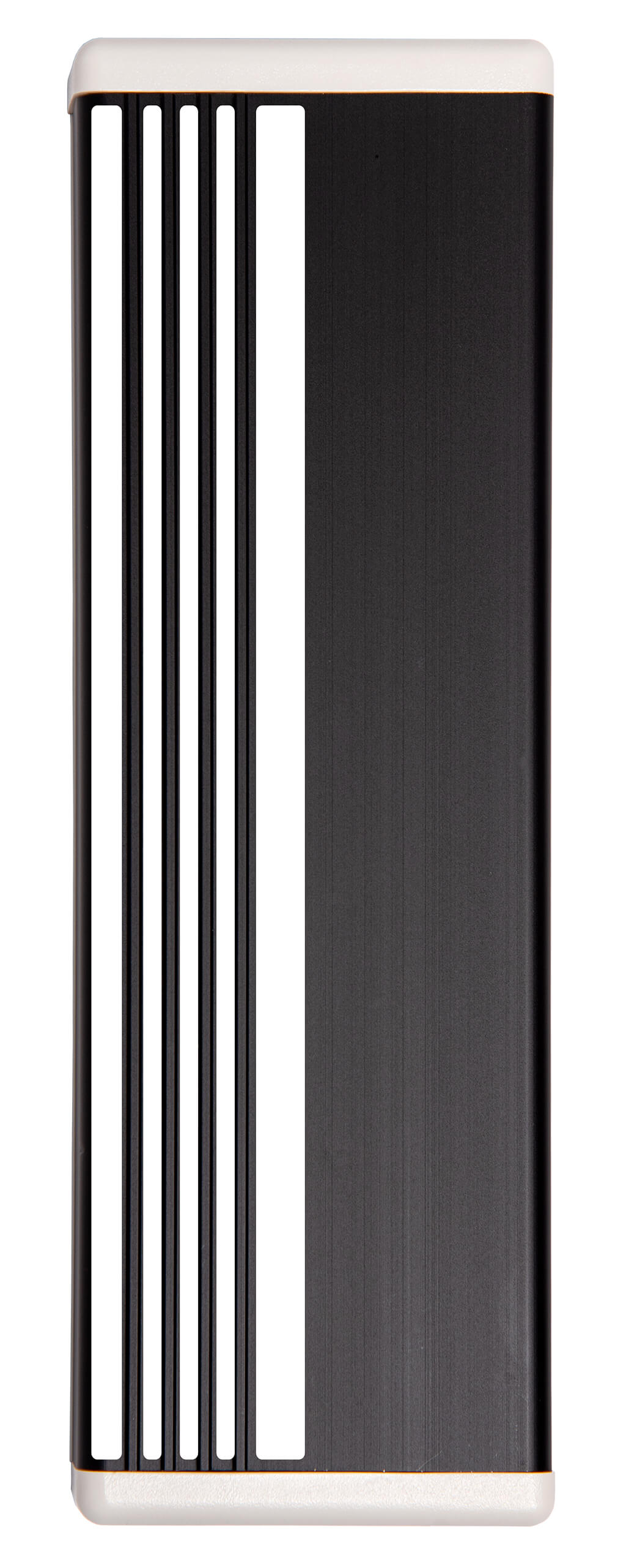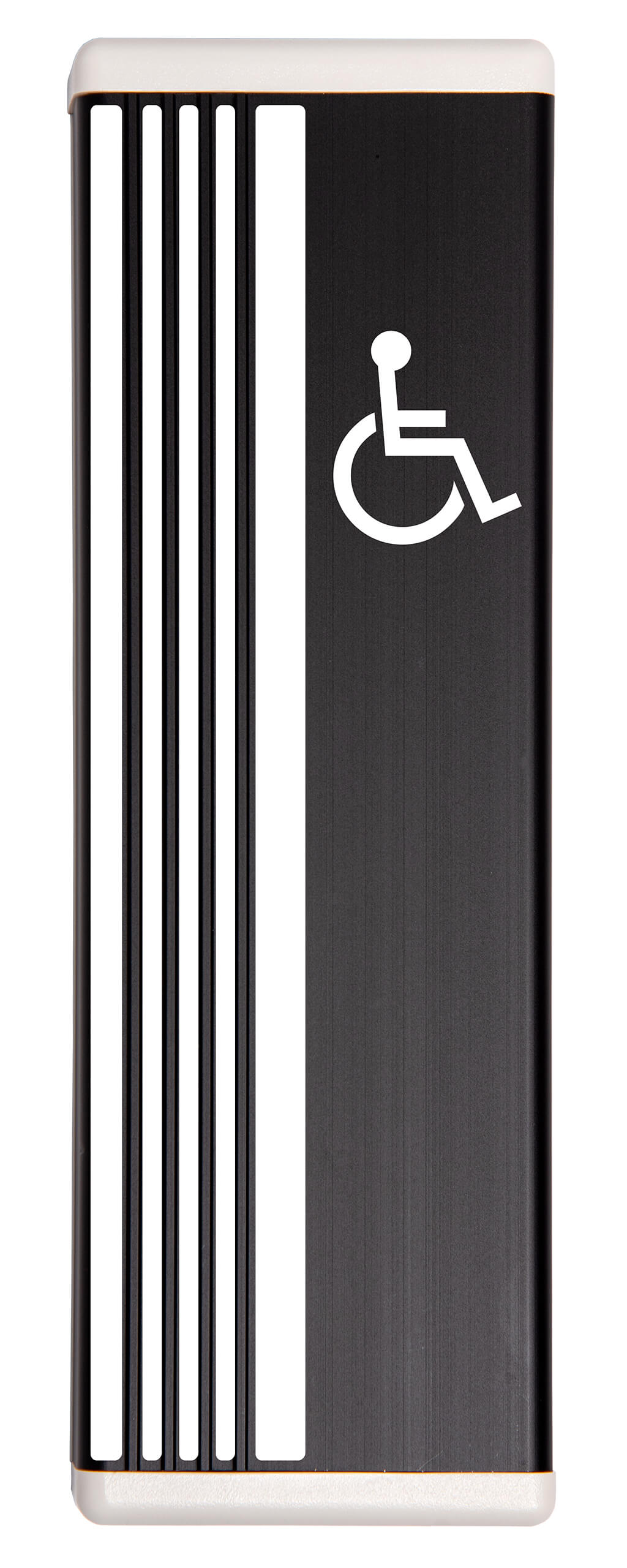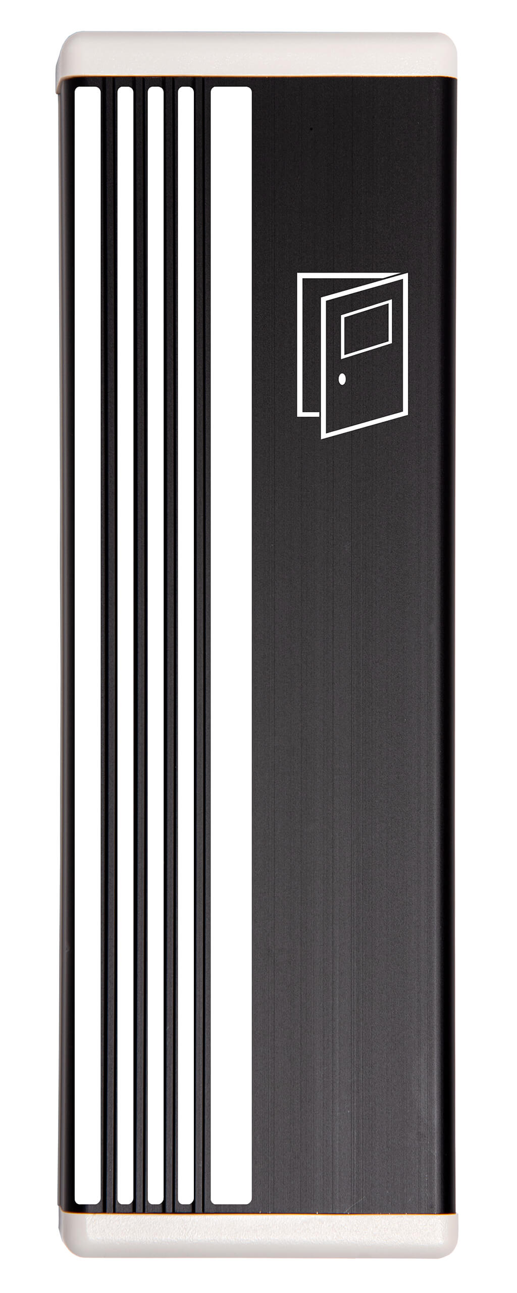 Armbågskontakt i svarteloxerad aluminium med vita endcaps. Plan tryckplatta med taktila rillor.